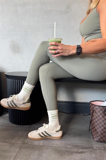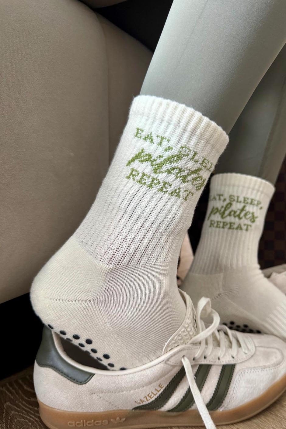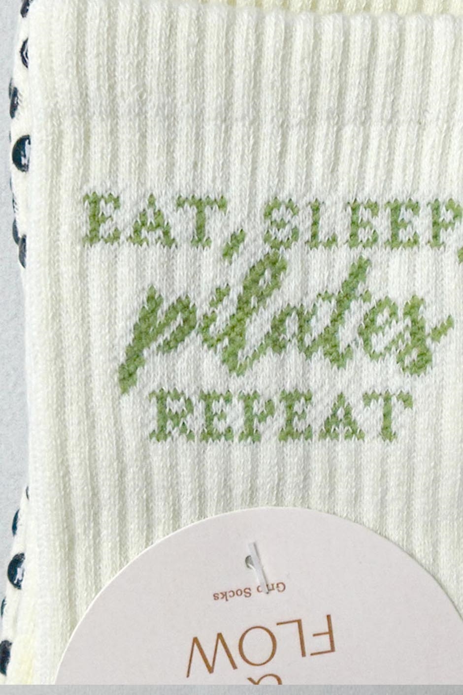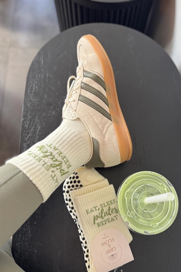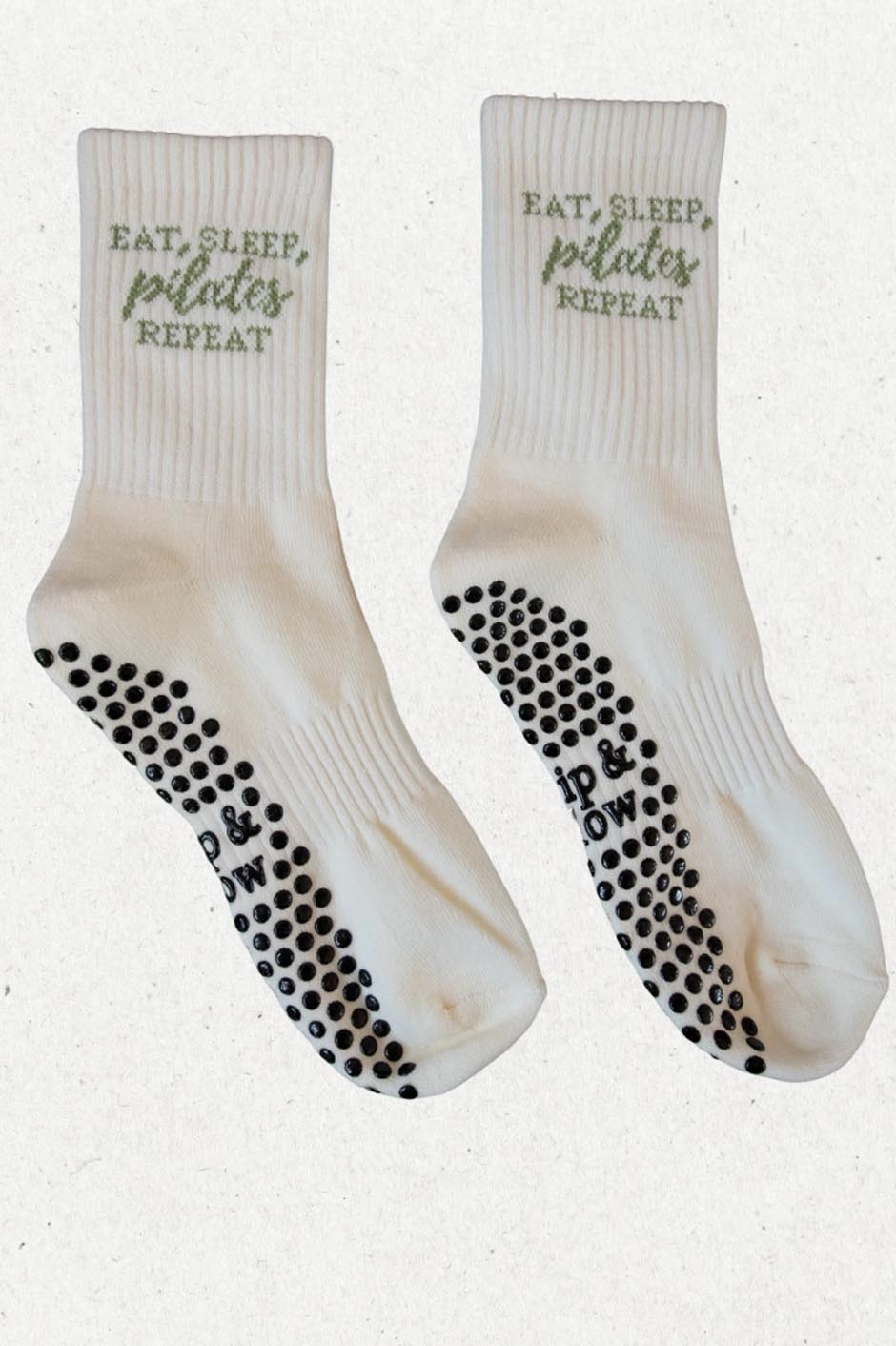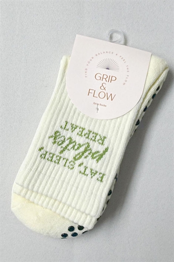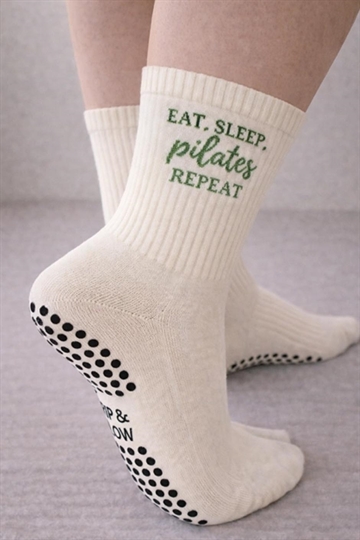 Eat, Sleep, Pilates, Repeat skridsikre sokker For dem, der lever og ånder for Pilates. Disse sokker er en blød og hyggelig hyldest til din yndlingsrutine med skovgrøn tekst og et blødt design, der bevæger sig med dig og holder dig stabil gennem hele timen. Fremstillet af en premium bomuldsblanding og med slidstærke silikonesåler med godt greb, er de perfekte til reformer-dage, hjemmetræning eller bare afslapning i din Pilates-æra. Detaljer: - One size passer de fleste (UK 4–8 / US 6–10) - Blød, åndbar bomuldsblanding - Signatur Grip & Flow silikonesål - Kan maskinvaskes - Designet i Storbritannien